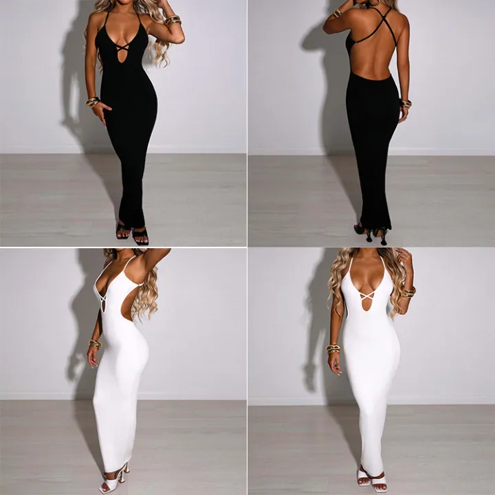 European%20and%20American%20women's%20summer%20strappy%20sexy%20buttocks%20tight%20solid%20color%20dress%20-%20Image%201